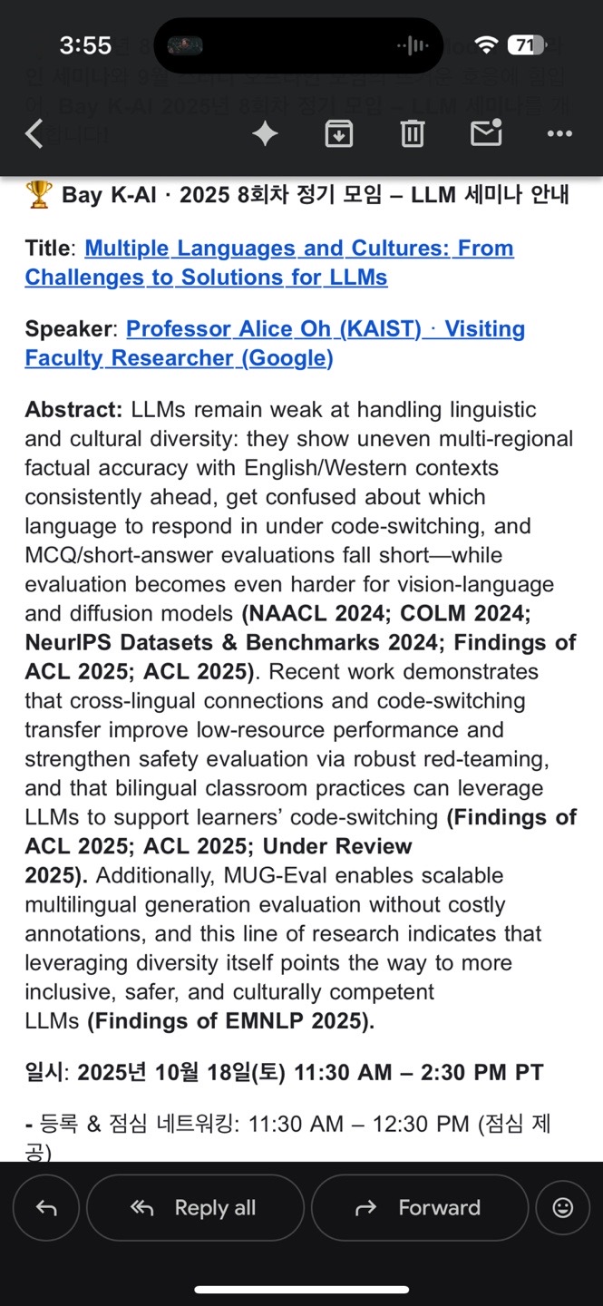 10월 18일 K-AI Group (K-Group AI 소그룹)에서 하는 LLM Seminar가 있어서 공지드립니다. KAIST의 LLM 전문가이신 오혜연 교수님 (현 Google 안식년)이 연사이시구요. 관심있으신 분들의 많은 참여 부탁드립니다. 세부 사항은 밑에 첨부 참고하시고, 인원 파악을 위한 Form에 Sign-up 해주시면, 감사하겠습니다.